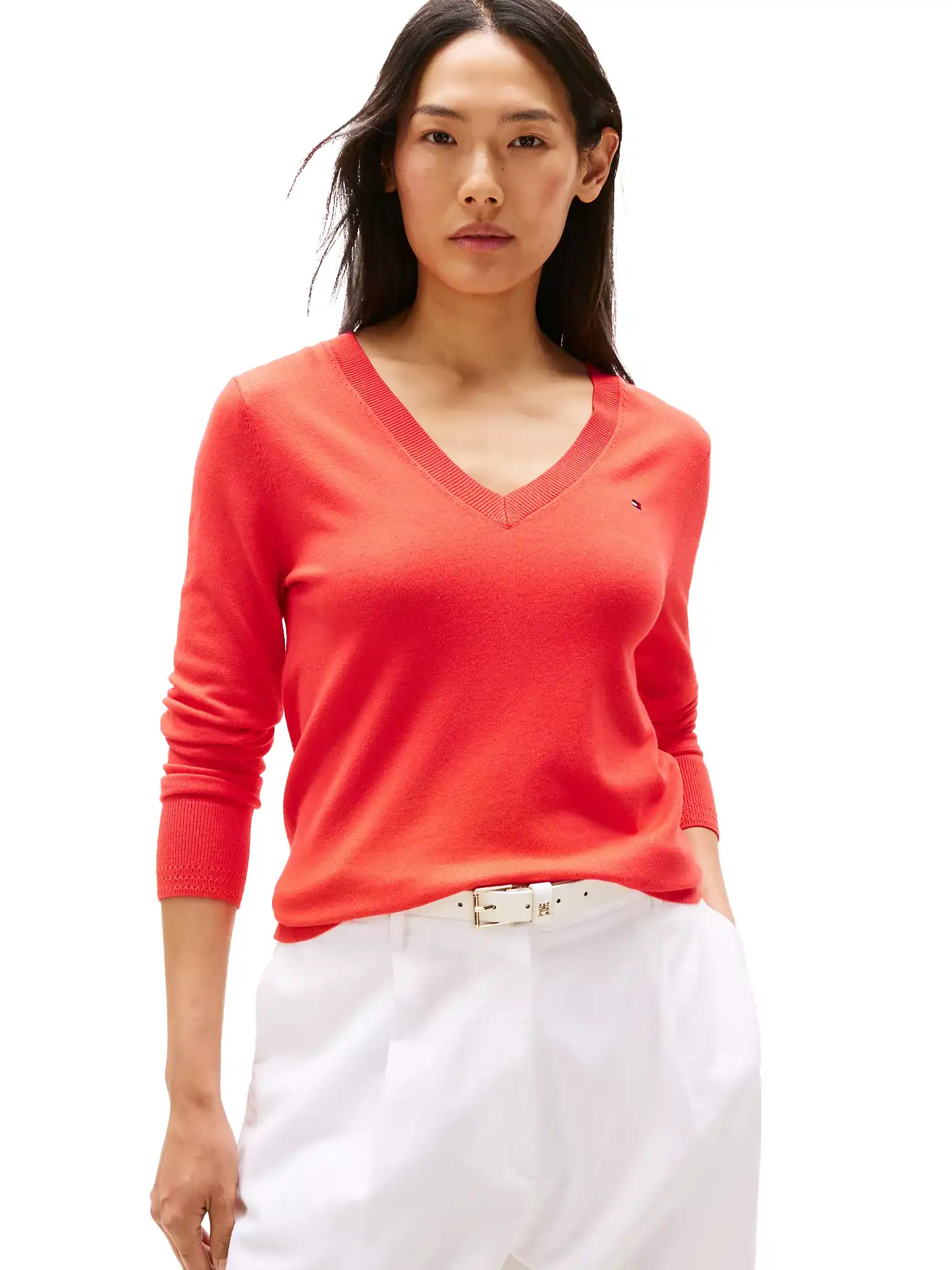 Suéter Tommy Hilfiger para mujer. Confeccionado en una mezcla de viscosa suave y sedosa, nuestro versátil suéter con cuello en V es la prenda ideal para cualquier ocasión, ideal para cualquier temporada.